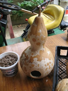 I've been cleaning out gourds this week and preparing them to turn into birdhouses. These are bushel basket gourds. The can get much bigger than this. My friend, Beverly, makes the coolest bowls out of these! She grew the large one and gave it to me. I think the smaller one came from the Farmer's Market.
